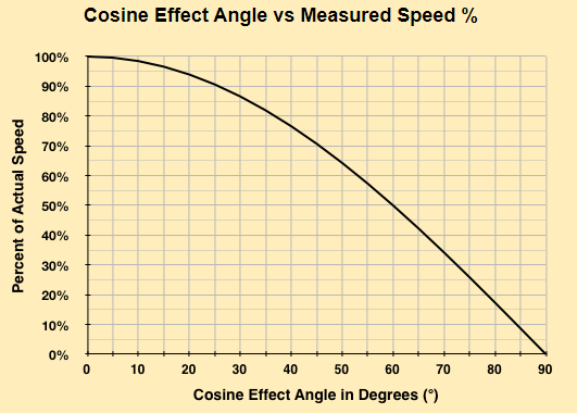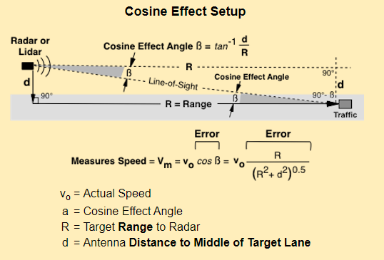 An effect when lidar gun (and therefore beam) and target are not perpendicular to each other. The larger the angle between the instrument and the target the larger the error in clocking a vehicle speed. This error results in an underestimation of the vehicles speed, meaning the display will show a speed less than that of the actual target speed. While we can't actually measure the tangent or simulate the lidar beam, it is a rough estimation based on heading. The reduction also has a random scalar, to help simulate the different surfaces the beam may be hitting each with a different tangent.